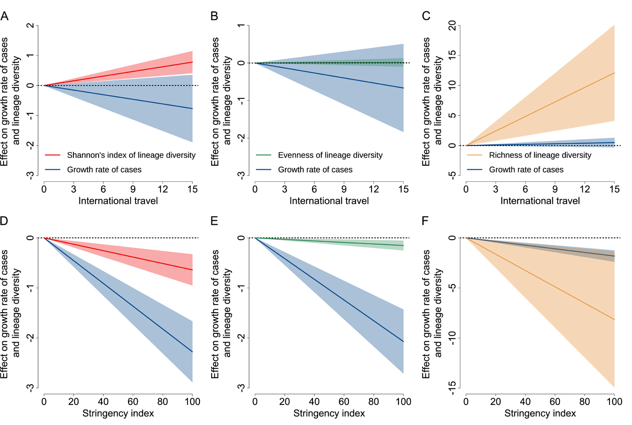 图1 干预行为与毒株谱系多样性、丰富度和均匀性的关联