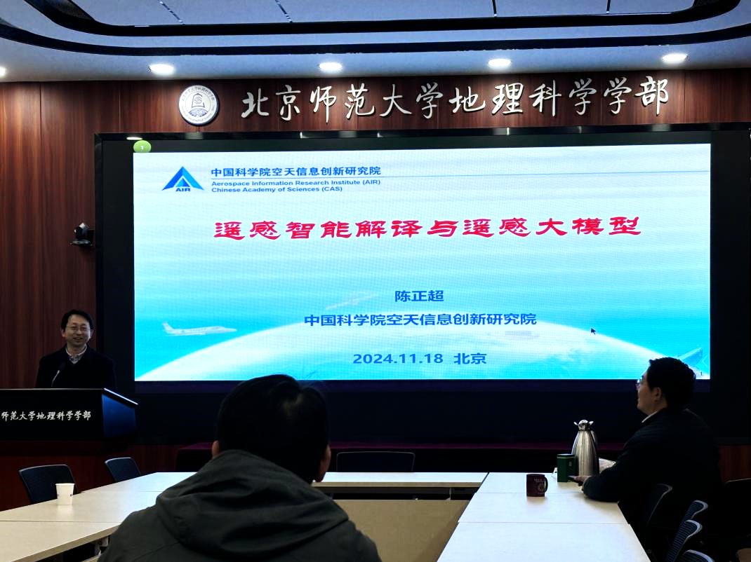 2024年11月18日下午,地理科学学部地理学院学术月系列讲座活动在生地楼180会议室如期开展。本期讲座由宫阿都教授主持,特别邀请中国科学院空天信息创新研究院陈正超研究员就遥感智能解译与遥感大模型进行学术报告与研究分享,学部20余名师现场参与交流研讨。